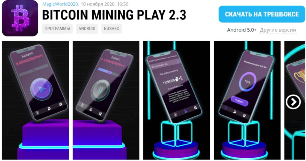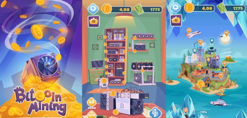 Биткоїн майнінг – це симулятор (клікер), де користувач може створити свою віртуальну ферму. Багато позитивних відгуків на Google Play.Розробники представляють свій проект як новий виток еволюції технологій, покликаний поєднати ігровий та криптографічний сектор у рамках однієї платформи.