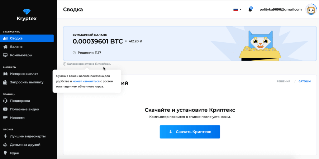 Після запуску програми в його основному робочому вікні будуть показані дані про те, скільки можна заробити за день і місяць (прогнозований дохід). Тут же доступні інформація про поточний статус програмного забезпечення і актуальний баланс користувача. Детально ознайомитися зі статистикою можна в особистому кабінеті на сайті розробника. Він автоматично відкривається при натисканні на посилання внизу робочого екрану криптекс ( «Повна статистика»).